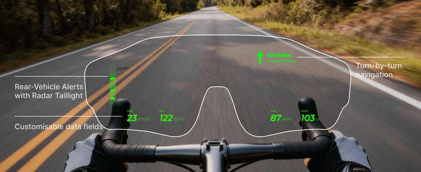 The HUD uses a waveguide lens made of tempered glass to project data at a comfortable distance in your field of vision. It’s shock-resistant, safe for your eyes, and reliable in motion.
