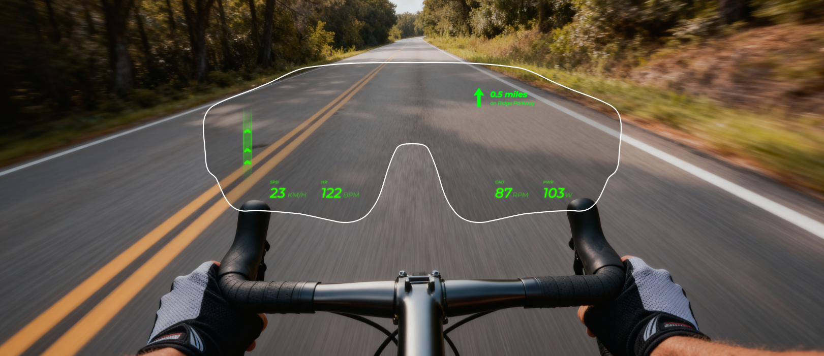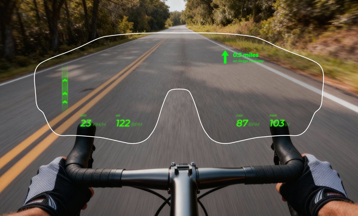 The HUD uses a tempered‑glass waveguide lens to project data at a comfortable virtual distance in your field of vision. It’s shock‑resistant, safe for your eyes, and designed so the information sits softly in your periphery, not plastered over the road.