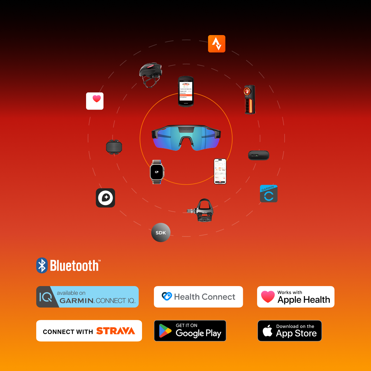 Syncs with iPhone, Android, Apple Watch, and Garmin devices to deliver real-time sensor data directly into your line of sight.