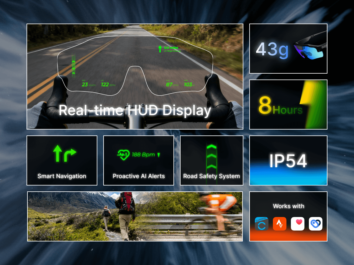 ZENITH redefines HUD glasses with dual-eye projection, ultra-lightweight design, and AI-powered insights. From heart rate and pace to navigation and safety alerts, every metric is delivered seamlessly, right where your eyes are. Built for runners, cyclists, and outdoor adventurers, ZENITH keeps you focused on your performance while staying connected to your environment.
