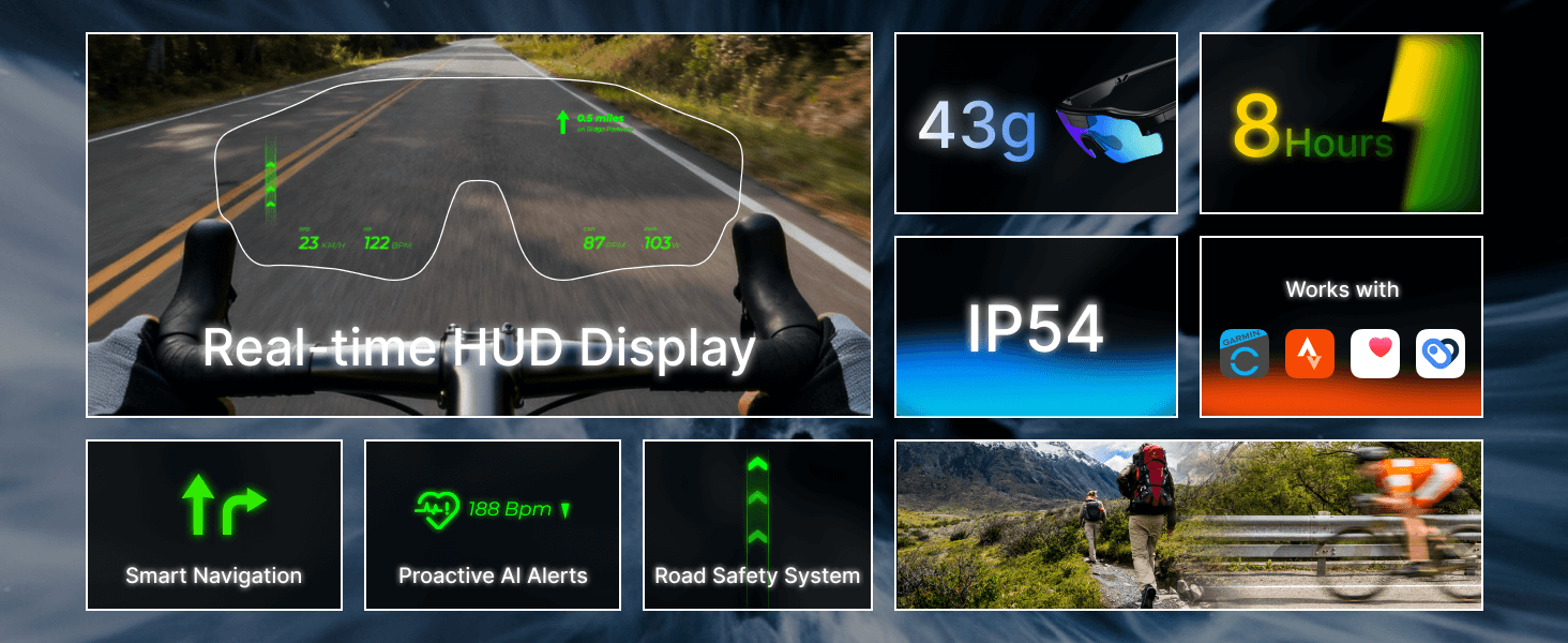 Heads-up display (HUD) glasses are next-generation sports eyewear that project real-time data directly into your field of view—so you never need to look down at a watch, phone, or cycling computer.
